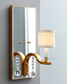 Diminutive sconce is a delightful addition to small spaces. Or use a pair to flank a window, favorite artwork, or a mirror. Imported.Made of antiqued mirror glass, iron, and crystal.Golden finish.White synthetic silk shade with polystyrene lining.Uses one 40-watt bulb.11W x 8D x 18T. Shade, 4Dia. x 4T.
